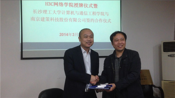 3月26日下午,我院与H3C网络学院、南京建策科技股份有限公司在理科楼一楼会议室举行H3C网络学院授牌仪式和校企合作签约仪式。院长李峰、H3C网络学院培训部部长朱冬光、南京建策科技股份有限公司总经理王继锋、我院领导、各部门负责人及企业负责人参加了此次活动。