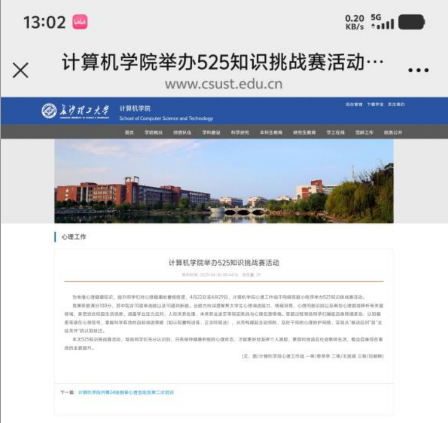 在 2025 年 5 月 “525 心理素质提升月” 期间,长沙理工大学计算机学院心理组围绕 “健康心灵,阳光成长” 主题,精心策划并开展了一系列形式多样的心理健康教育活动。本届活动涵盖摄影征集、素质拓展、知识竞赛、主题班会及朋辈培训五大板块,不仅提升了学生的心理健康意识,更通过实践互动增强了团队凝聚力与自我调节能力。活动总结如下: