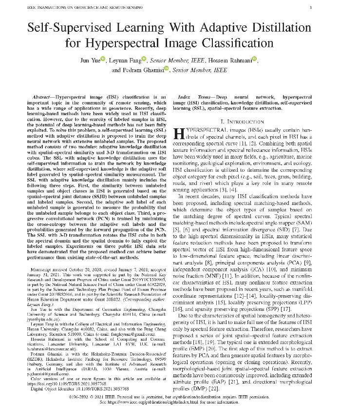 Jun Yue, Leyuan Fang, Hossein Rahmani and Pedram Ghamisi, "Self-Supervised Learning With Adaptive Distillation for Hyperspectral Image Classification," in IEEE Transactions on Geoscience and Remote Sensing, doi: 10.1109/TGRS.2021.3057768。(文/李金莲 审/孔伟红)