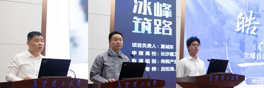 “冰峰筑路”——世界屋脊冻土区高性能沥青领航者,“皓途智检”——全球首创路面压实智能检测机器人等科创竞赛获奖团队指导教师代表李希,团队成员夏诚东、王成博作项目路演展示及参赛经验分享。