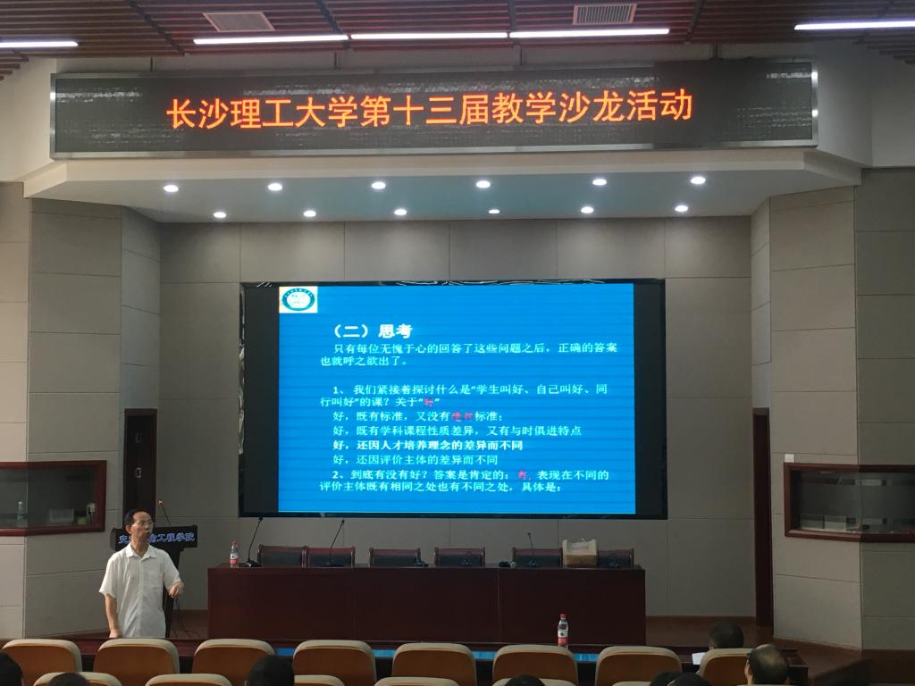 9月25日下午,由教务处主办、交通运输工程学院承办的第十三届教学沙龙活动在云塘校区工科二号楼B301多功能报告厅成功举行。学院特邀《高教发展与评估》杂志编委、湖南省高校教学管理委员会副秘书长、长沙理工大学刘绍勤教授主讲,交通学院院长助理李珏主持,教务处教学质量管理主任干事曾洁及来自全校16个学院共计80多名教师出席。