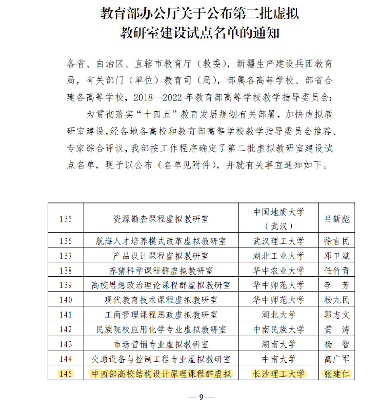 近日,教育部发布了第二批虚拟教研室建设试点名单的通知,共有218个虚拟教研室入选。土木学院国家教学名师张建仁教授牵头的“中西部高校结构设计原理课程群虚拟教研室”成功入选。
