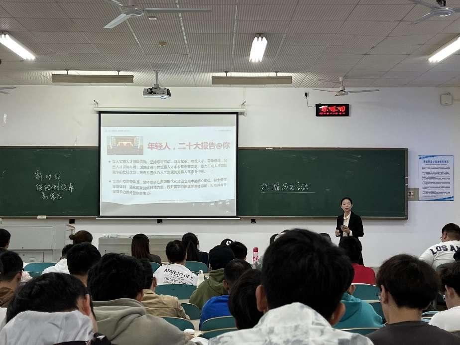 用党的科学理论武装青年,用党的初心使命感召青年,铸魂育人、立德树人是高校思政课教师的使命与责任。党的二十大报告新鲜出炉,便走进了长沙理工大学马克思主义学院老师主讲的思政课堂。在陈万球书记的“道德与法治”课堂上,他引用习近平总书记对青年寄语,谆谆告诫同学们要“坚定不移听党话、跟党走,怀抱梦想又脚踏实地,敢想敢为又善作善成,立志成为新时代好青年。”在钟芙蓉博士的党的二十大报告主题公开课上,她围绕党的二十大报告,设计了大变革赢来新时代;新时代产生新课题;新课题呼唤新思想;新思想引领新时代四个板块,深情讲述了习近平新时代中国特色社会主义思想的发展历程和历史地位。