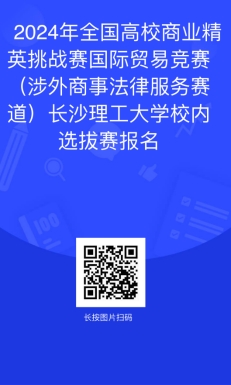 为进一步贯彻落实国家创新创业人才培养的要求,推进涉外商事法律服务的互动与交流,促进雷竞技官网全学科之间的交流,提高创新创业人才培养质量,雷竞技官网拟定于2024年9月29—10月15日举办2024年全国高校商业精英挑战赛国际贸易竞赛(涉外商事法律服务赛道)长沙理工大学校内选拔赛。现将竞赛有关事项通知如下: