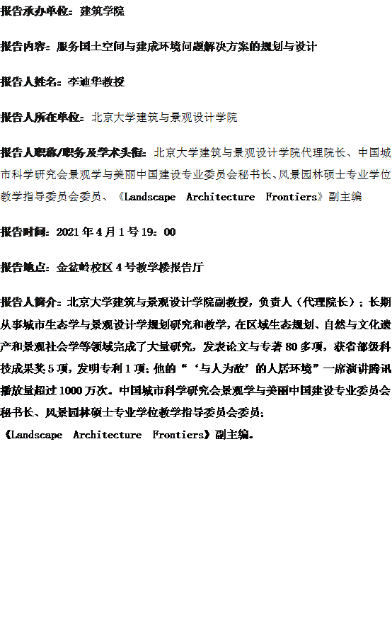 学术预告:北京大学建筑与景观设计学院代理院长---李迪华应邀来建筑学院学术讲座