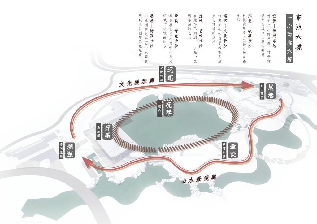 围绕“绿色城市,美好生活”园区主题,生态创新传承可持续特色,呈现生态美、生活美、文化美。设计从古代士大夫阶层的审美意趣出发,以长沙历史上第一座宫苑园林“东池”为脉络,通过将长沙典型要素重组,再现“小瀛洲”、“瑶台”、“石牌楼”、“鸳鸯井”等空间结构。