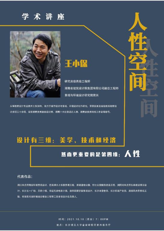 2021年10月10日晚7:00点,湖南省建筑设计院副总工程师王小保在长沙理工大学金盆岭校区第四报告厅,主讲了以《人性空间》为主题的学术讲座,分享从业30年以来对设计创作的感受,讨论以功能展开城市设计的新篇章。