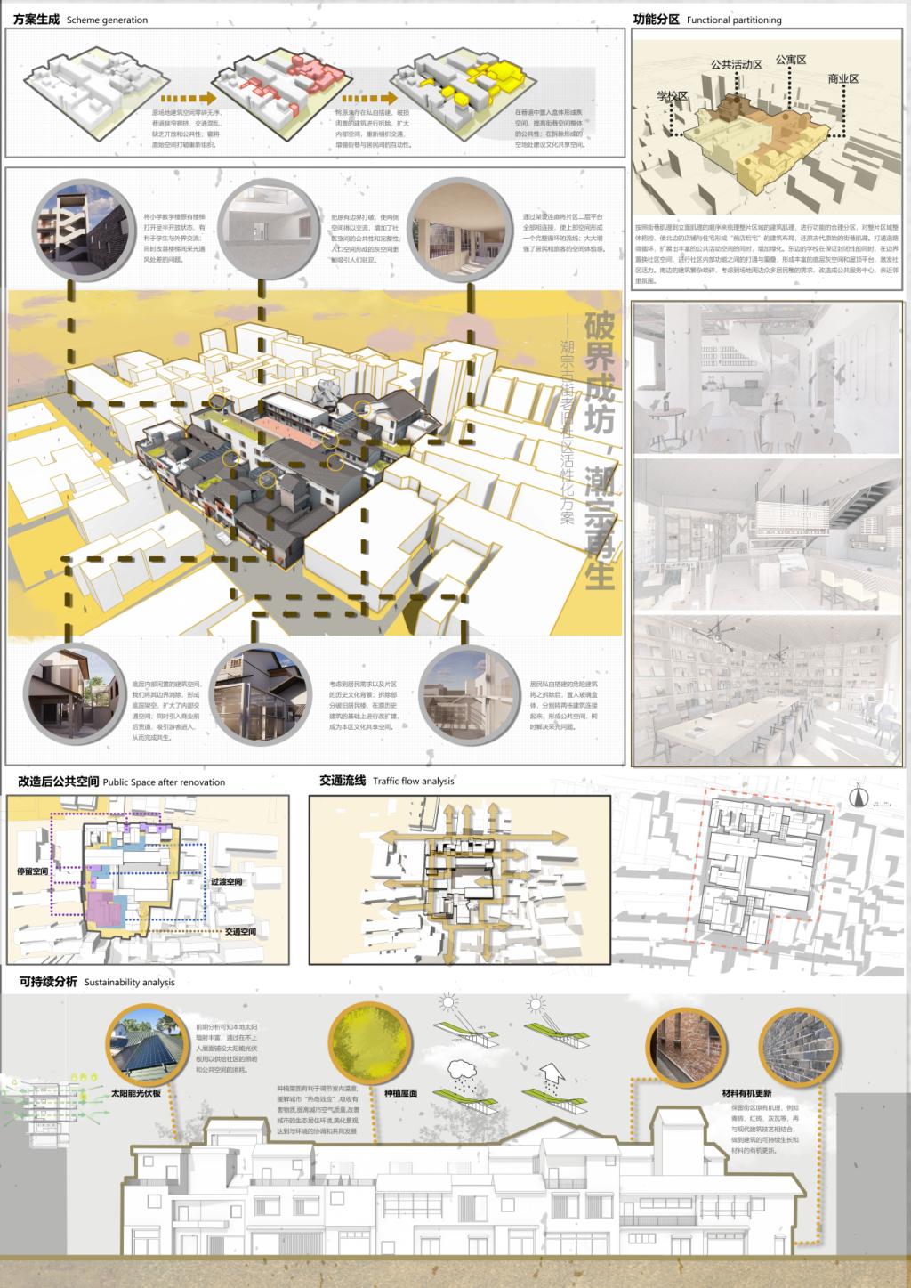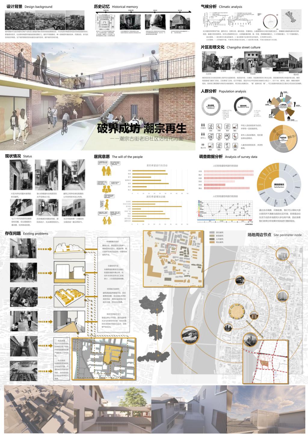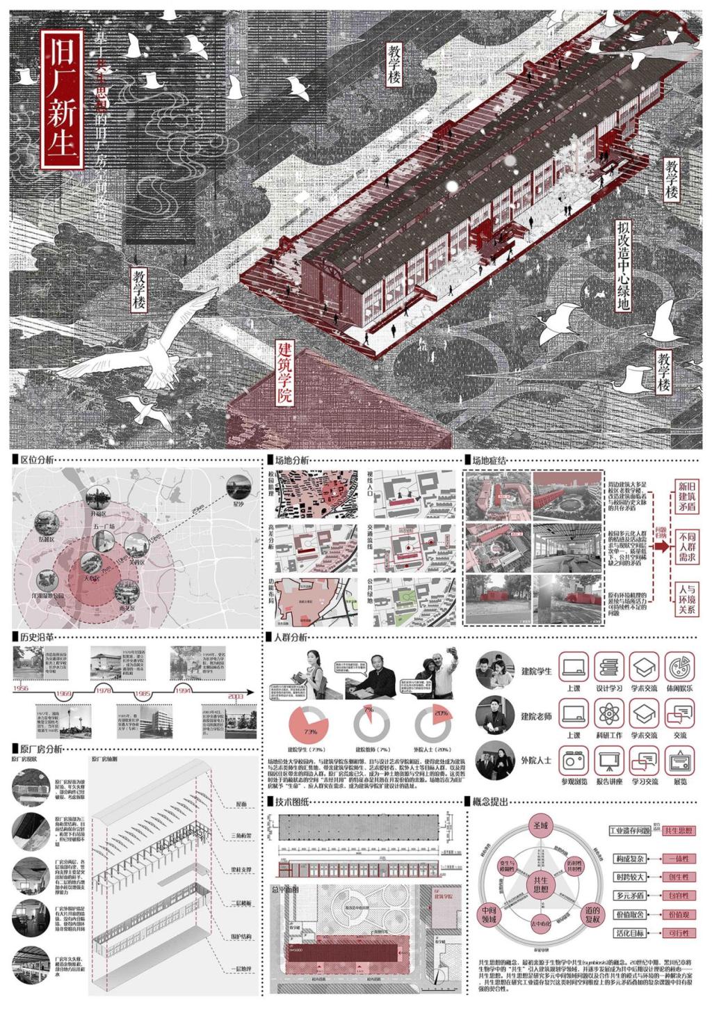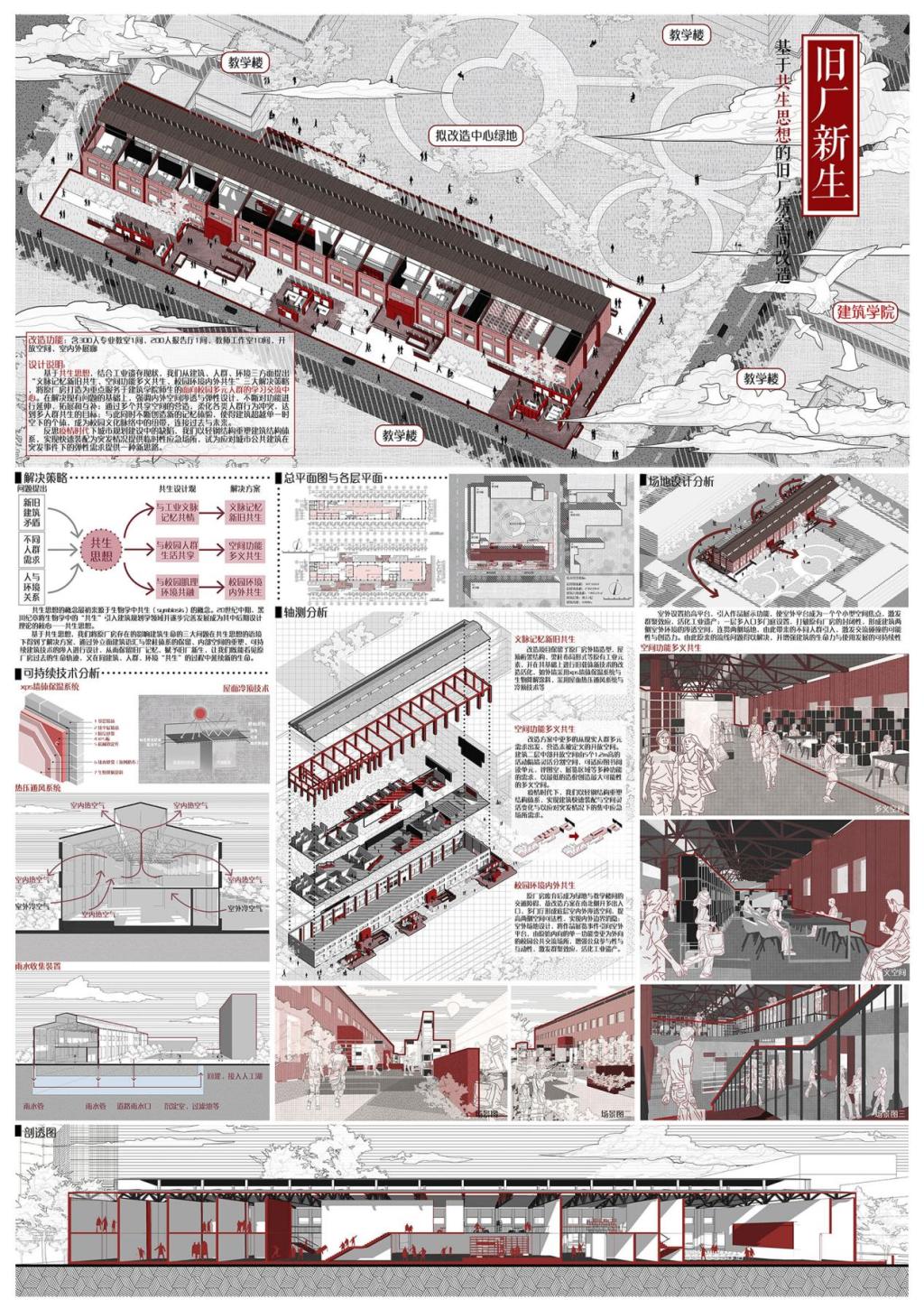 经大赛组委会评审专家现场评审,共评选出个人奖160项,其中一等奖27项、二等奖54项、三等奖79项;优秀指导教师23人;优秀组织奖4项。我院在本次大赛中取得一等奖两项、二等奖九项、三等奖十一项的好成绩。其中,由许建和、宋晟老师指导的何飞璇、熊婉乔同学的作品《旧厂新生——基于共生思想的旧厂房空间改造》、以及由马成也老师指导的彭扬锐、余商、刘齐锐同学的作品《破界成坊,潮宗再生》荣获一等奖。