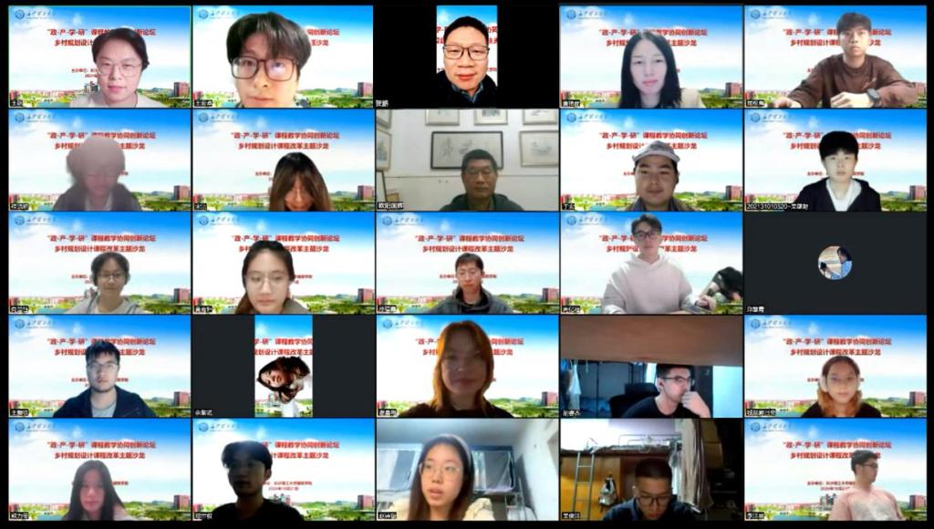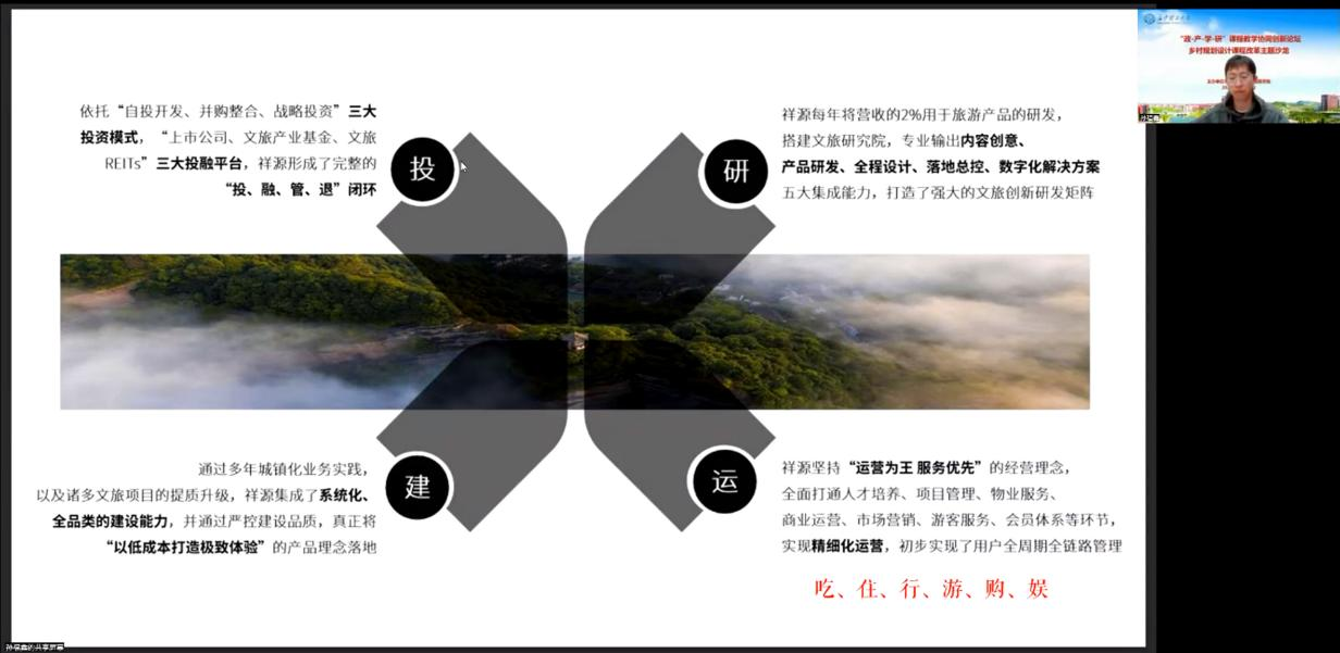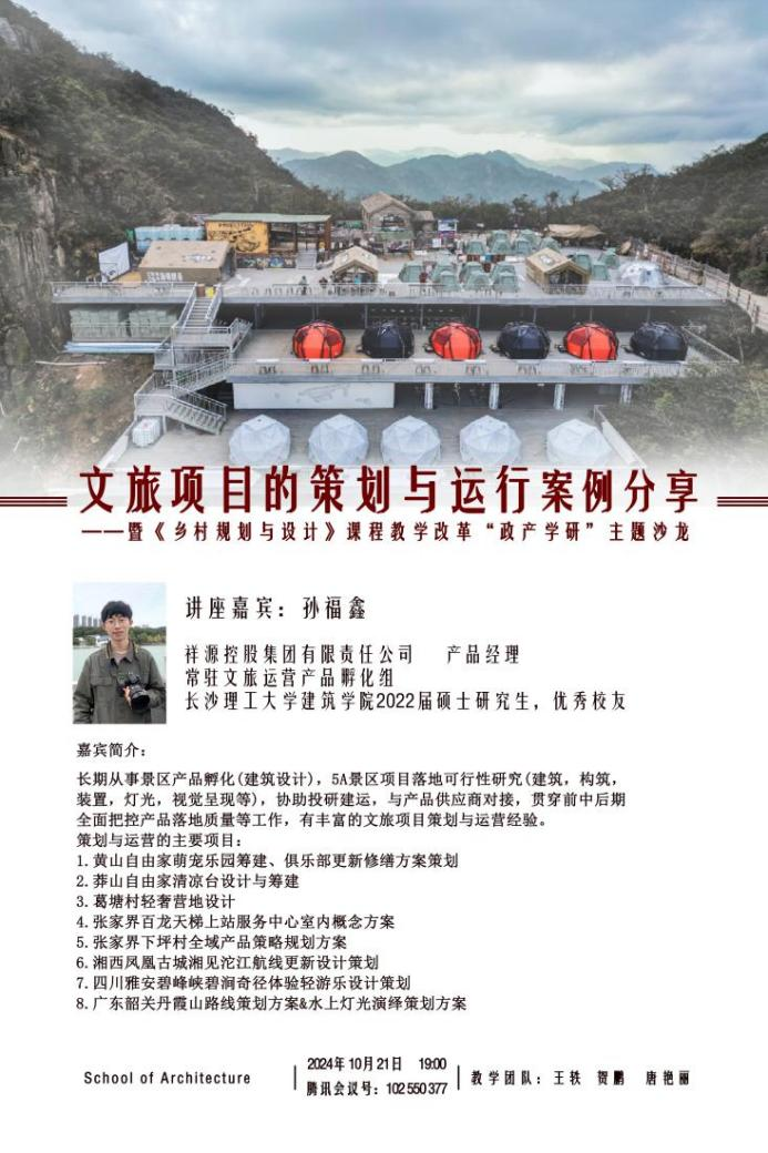 为积极响应国家“乡村振兴”人才培养的战略需求及其新时期村镇发展的趋势与市场需求,激发高校学子的乡村振兴、地方发展责任感,10月21日晚,由湖南省国土空间规划学会规划教育工作委员会指导、长沙理工大学建筑学院主办的“政产学研”课程教学协同创新论坛——乡村规划设计课程改革主题沙龙在线上成功举行。本次活动邀请了祥源控股集团有限责任公司常驻文旅运营产品孵化组的产品经理,长沙理工大学建筑学院优秀校友,孙福鑫先生做“文旅项目的策划与运行”的案例分享与有关设计类专业人才创新思维培养的教研讨论。长沙理工大学教学督导、建筑学院欧阳国辉教授,城规系系主任贺鹏老师,乡村规划课程组王轶老师、唐艳丽老师和2021级城规专业全体本科生、建筑学院部分研究生参与了本次活动。