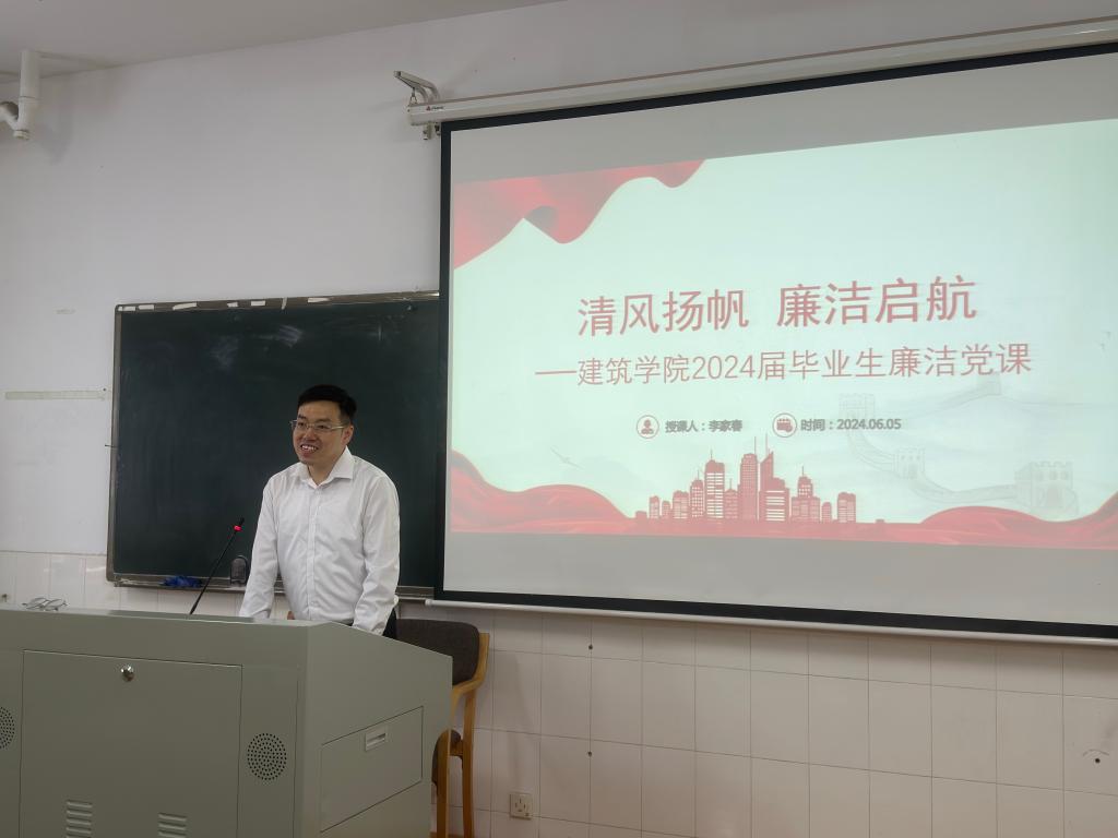 为进一步加强毕业生党员教育管理,引导毕业生党员坚定共产主义远大理想和中国特色社会主义共同理想,深刻领悟“两个确立”的决定性意义,增强“四个意识”、坚定“四个自信”、做到“两个维护”,增强党性,提高素质,充分发挥先锋模范作用。6月5日下午,建筑学院组织毕业生党员开展了一场别开生面的廉洁党课活动,本次党课由建筑学院党委副书记李家春主讲,建筑学院学生党支部书记郭恒及47名毕业生党员共同参加。