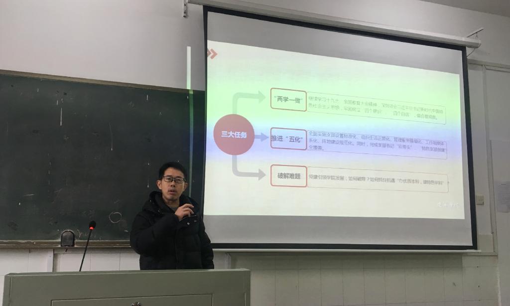 丁力从《条例》制定的背景、制定的意义以及遵循的原则进行了阐述,认为《条例》是我党历史上第一部关于党支部工作的基础主干法规。《条例》以习近平新时代中国特色社会主义思想为指导,贯彻党章要求,落实新时代党的组织路线,既传承“支部建在连上”光荣传统,又体现党支部建设新做法新经验,具有很强的指导性和时代感,为全面加强新时代党支部建设提供了基本遵循。《条例》紧密结合实际,突出问题导向,着眼补齐短板,对创新党支部设置、完善工作机制、开展组织生活和加强党支部委员会建设等作出明确规定。最后,丁力结合我院党建工作实际,要求各基层党组织加强《条例》的学习宣传和贯彻落实,牢固树立“四个意识”,深入推进“两学一做”常态化以及支部“五化”建设,全面提高新时代党支部建设质量,为学院发展提供坚强的组织保障。