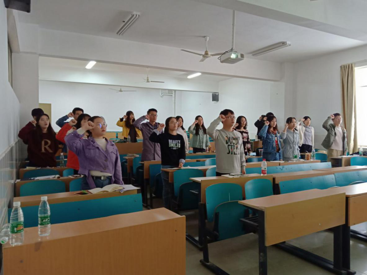 党课的最后一部分,全体党员起立,跟随关雅婷同志宣读入党誓词。在本次党课中,关雅婷同志向全体学生党员提出倡议,希望建筑学院全体学生党员能够坚持不懈的学习“不忘初心、牢记使命”主题教育知识,加强政治理论素养,加强党性培养,为学院的党建工作建设贡献自己的一份力量!