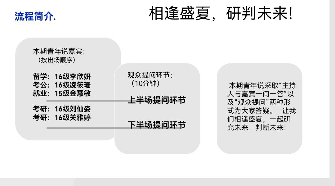 本期青年说嘉宾的经验分享囊括留学、考研、考公和就业四个发展方向,从不同的方向,让同学们更深入地了解毕业后的学习与生活,此外本次活动分为两部分,第一部分采用主持人与嘉宾一问一答形式,解答一些大家都想了解的问题。第二部分是观众提问环节,同学们可以畅所欲言,提出自己想要了解的问题。