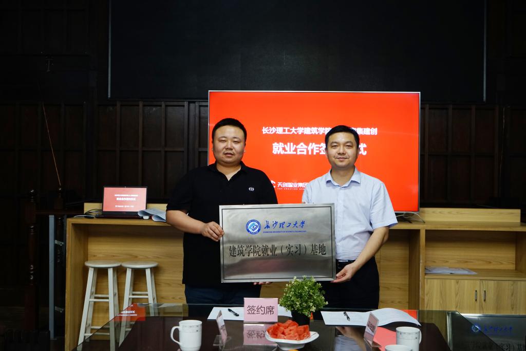 激活就业活力,为企引才,为校拓岗。6月7日,为提高毕业生就业质量,进一步推进校企合作,实现校企互惠共赢,长沙理工大学建筑学院与天创集团就业基地合作签约仪式在后湖召开。长沙理工大学建筑学院党委书记熊鹰、党委副书记李家春、建筑系主任吴荻子、建筑系副教授易学尧、就业专干王宇霖、天创集团董事长张楠、执行总裁周政安、总经理陈红壘、品牌总监邓漫飞出席参加此次仪式。