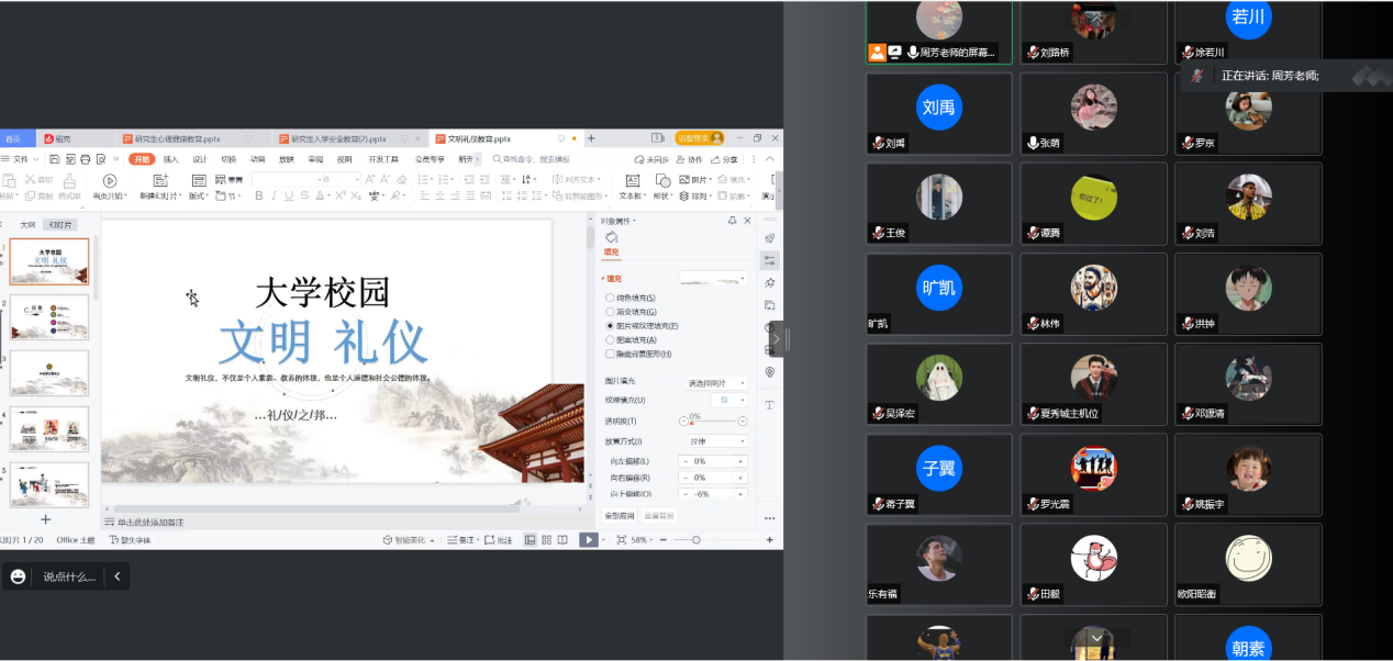 为践行社会主义核心价值观,弘扬中华民族传统美德。2022年8月30日16:00,建筑学院开展文明礼仪专题线上教育活动,会议由学工办周芳老师主持,全体2022级新生研究生参会。