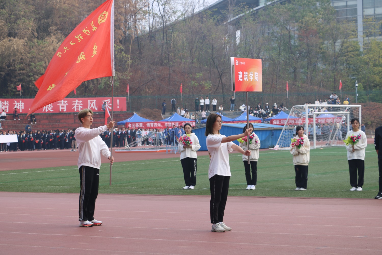 校党委副书记刘建民致运动会开幕辞。他指出,过去一年里学校在特色体育运动实践和体育赛事方面取得了优异成绩和丰硕成果。体育运动已经成为了学校文化和师生精神文明生活的重要组成部分。随着音乐声响起,大型团体操表演《等你来》拉开了开幕式的帷幕。随后,庄严的国旗,校旗与校徽依次通过主席台,各学院代表方阵随其后依次入场。建院学子们身着白衣黑裤,整齐的着装展现出学院良好的风貌。领队高举建筑学院院旗,带领方阵整齐划一地走向主席台下。他们是学院的代表,向全校师生展示建院人的信念与斗志。三名同学手持木制建筑模型,展示出专业特色。他们眼神坚定,步伐统一,昂扬的精神面貌是他们交上的青春答卷;高举的标语是他们自信的青春呐喊,昭示着他们必胜的决心。