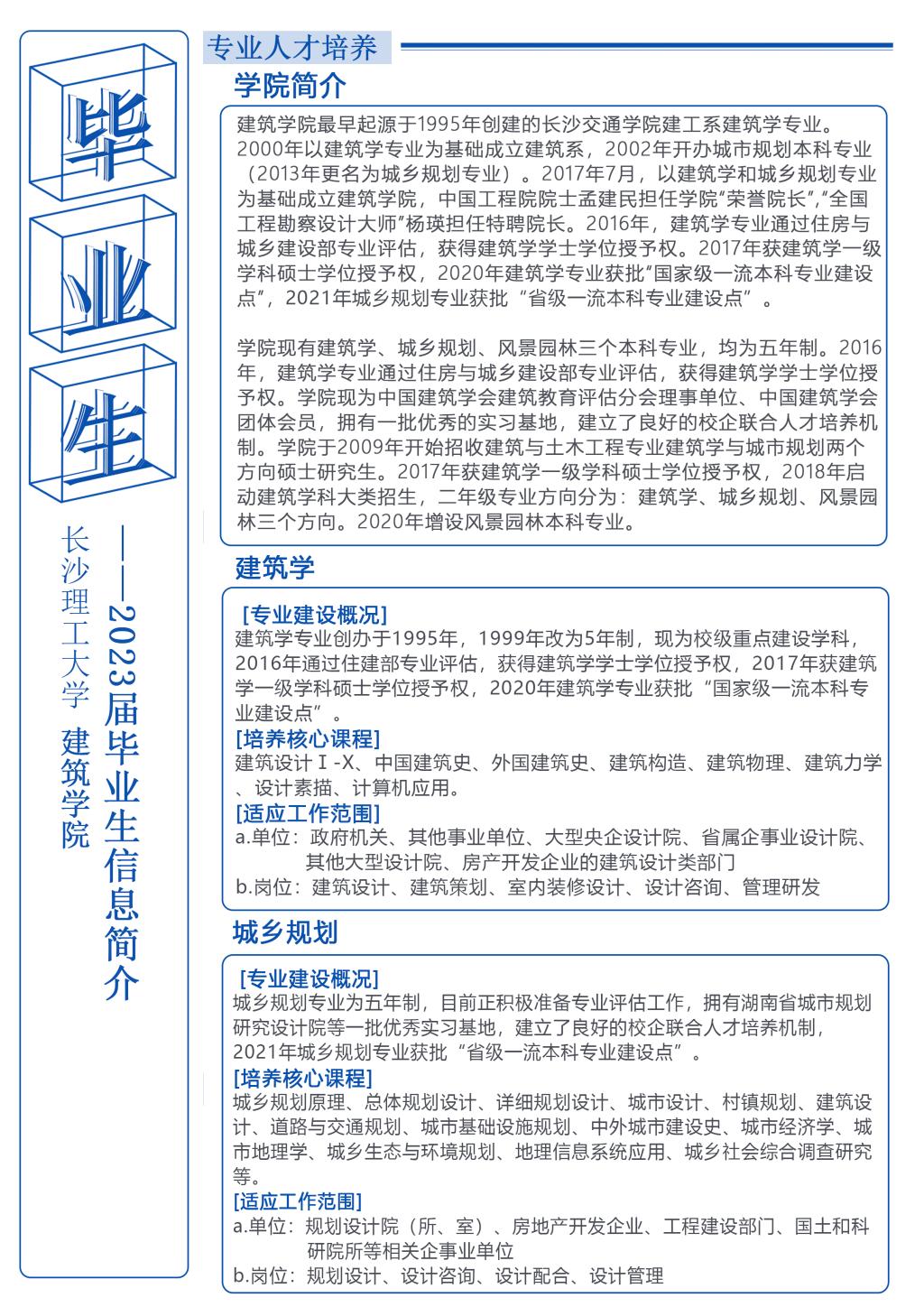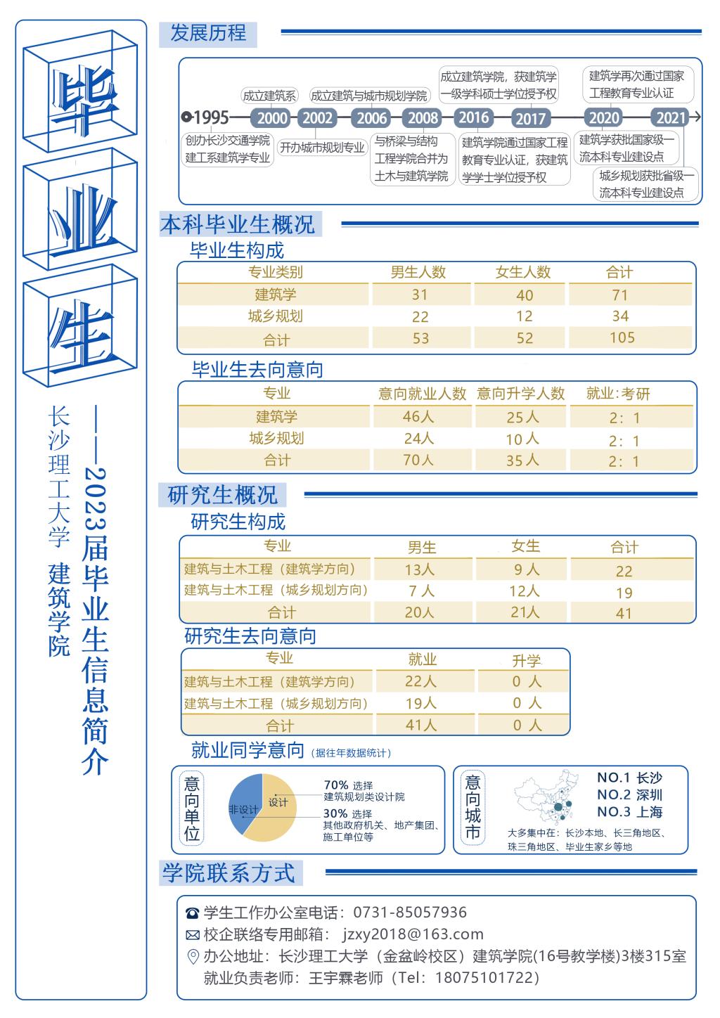目前建筑学院 2023届毕业本科生共有 105 人,其中建筑学专业 71 人,城乡规划专业 34 人。毕业研究生共有 41人,其中建筑学方向22 人,城乡规划方向 19 人(毕业生信息详见《附件一》)。为使我院毕业生与用人单位达成良好的沟通,配合贵单位做好 2023届毕业生接收工作,我院兹定于 2023 年 3月 1日——6月 10日举办长沙理工大学建筑学院2023年春季招聘会。诚挚邀请贵单位光临指导!
