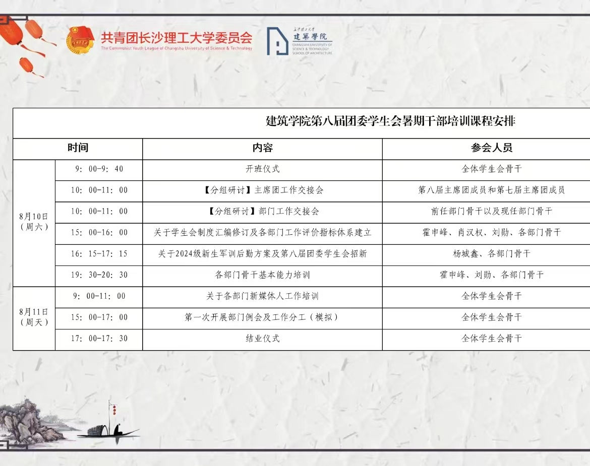 为确保下学年迎新、招新等相关工作顺利开展,2024年8月10日至11日,建筑学院第八届团委、学生会于线上开展暑期培训会。团委书记杨斯嘉以及第八届团委、学生会全体成员参加此次会议。