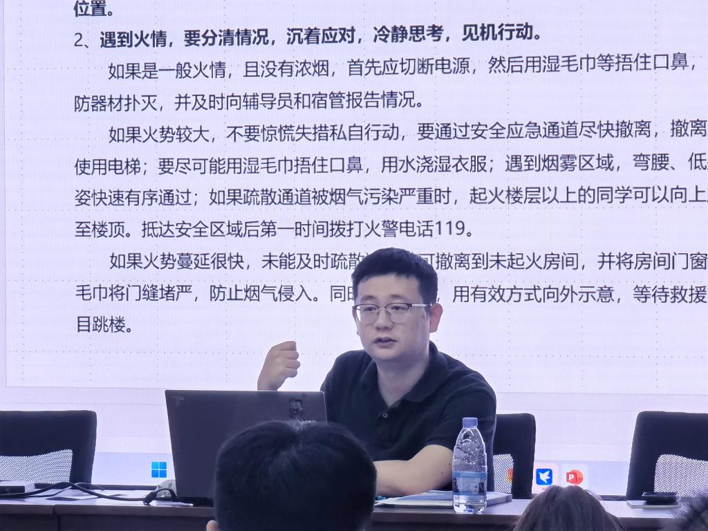本次安全教育专题学习王宇霖老师从人身安全、财产安全、消防安全等方面进行详细阐述,并着重强调四点:一、节假日外出或因事因病请假需严格履行研究生外出请假手续并在钉钉系统进行报备;二、电信诈骗层出不穷,如遇电话问询请及时和家庭、学校进行核实,严禁网络商业贷款;三、不在宿舍、工作室等地使用大功率电器,严禁明火;四、机动车需向保卫处报备,在校遵守电动车骑行及停放规定。