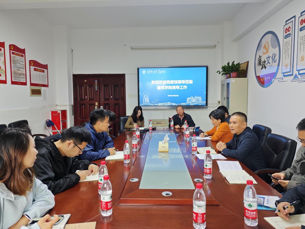 10 月 21 日上午,长沙理工大学档案馆馆长陈坤、副馆长王任飞一行6人深入学院,就档案管理工作进行专项调研指导。此次调研旨在全面了解学院档案管理的现状,推动档案管理规范化、标准化建设。学院代理党委副书记肖义慧,科研办主任李琼,办公室主任潘巧伟、干事尹志,教务办主任张毅,以及学工办王宇霖、陶蓝、杨斯嘉等相关人员参加了会议和陪同调研。