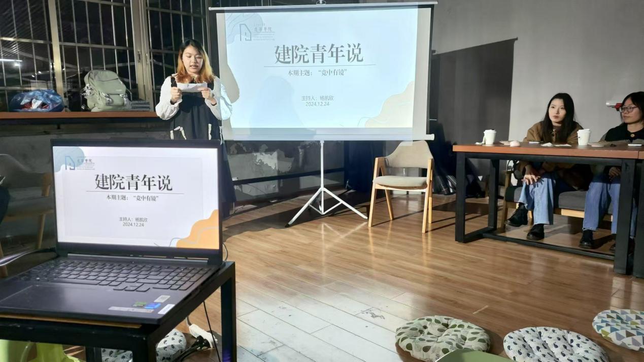 2024年12月24日晚上,在长沙理工大学金盆岭校区16号教学楼的一楼展厅,建筑学院成功举办了主题为“竞中有镜”的青年说活动。本次青年说邀请了21级建筑学宋佳玲、21级城乡规划向楚钰、21级风景园林汪鲲鹏为主讲嘉宾。