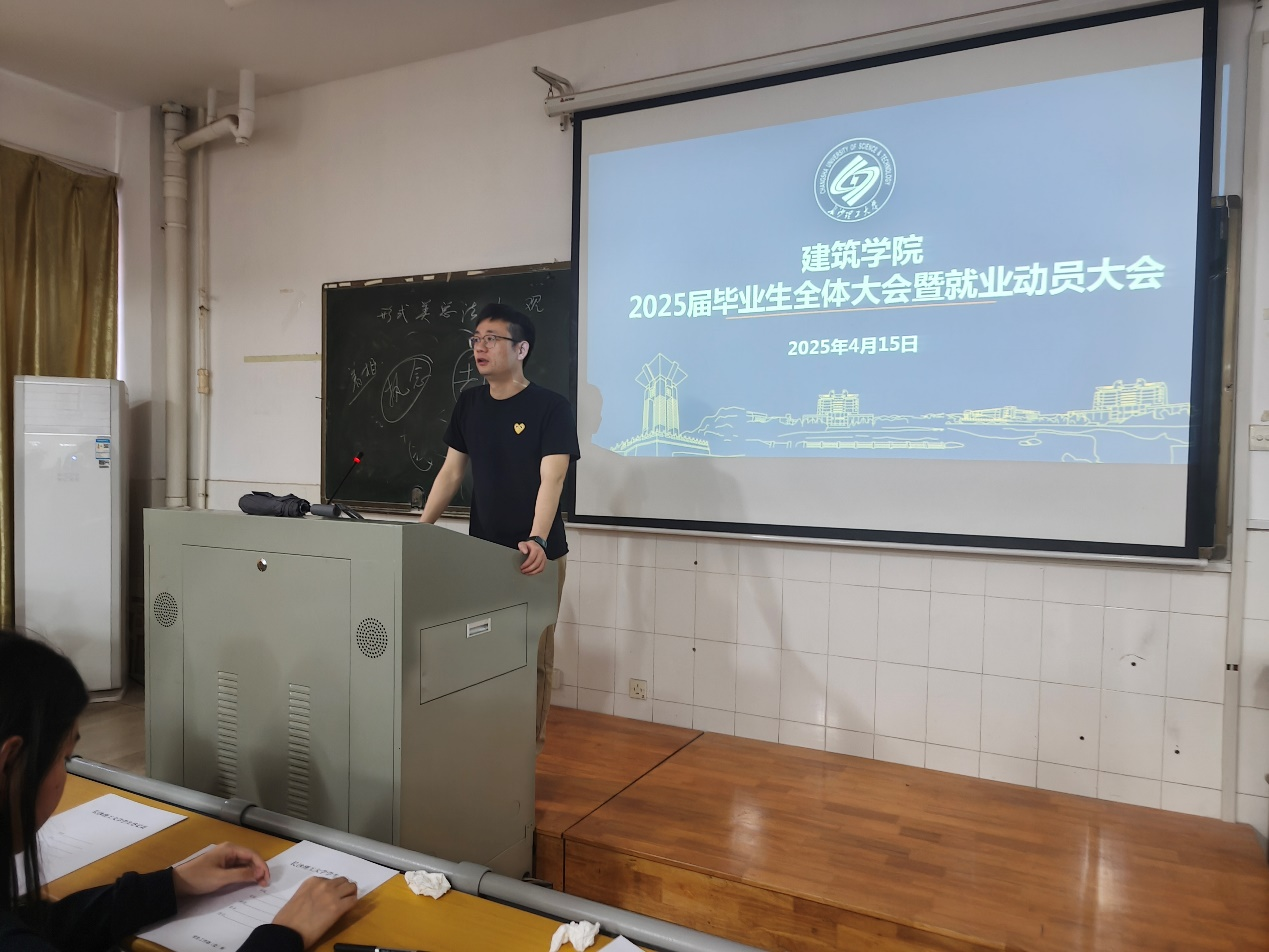 4月15日下午,建筑学院在16号教学楼314教室召开了2025届毕业生全体大会暨就业动员大会,全体2025届毕业生参加会议,会议由辅导员王宇霖老师进行主持。