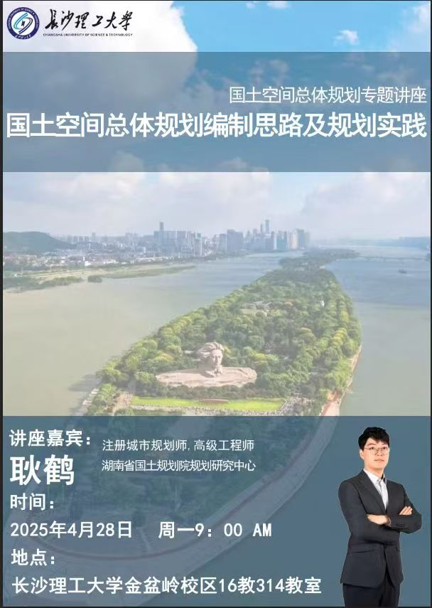 2025年4月28日上午,为进一步提升师生对国土空间总体规划工作的理解与认知,深入贯彻党的二十大精神及习近平生态文明思想,落实“多规合一”的战略要求,长沙理工大学建筑学院举办了一场关于《国土空间总体规划编制思路及规划实践》的学术讲座。本次讲座由湖南省国土资源规划院注册城乡规划师耿鹤主讲,为建筑学院师生系统阐释了国土空间总体规划的基本内涵与重要意义。