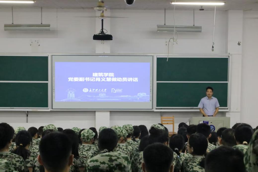 大会伊始,全体师生起立奏唱国歌。紧接着,建筑学院党委副书记肖义慧进行军训动员讲话。他从多维度强调了军训对于大学生的积极意义,他指出军训对增强国防意识、组织纪律性、思想素养和身体素质的重要性,并期望新生们重视军训,积极面对挑战,遵守纪律、科学施训,鼓励大家以积极态度参与军训,展现新时代青年风采。