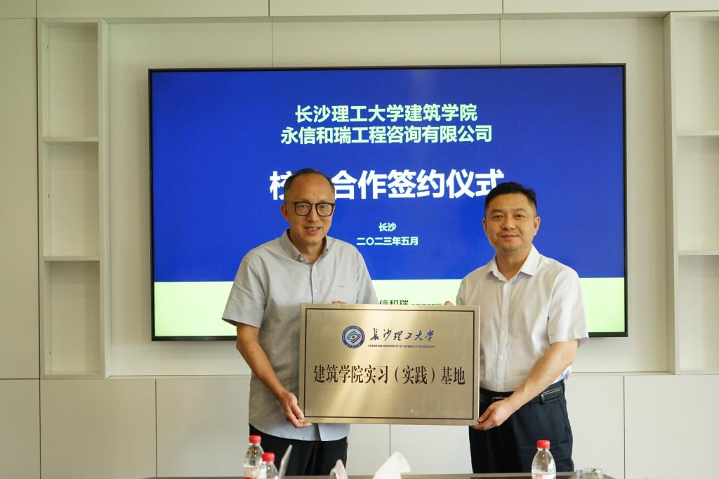 座谈会后,长沙理工大学建筑学院与永信和瑞工程咨询有限公司正式签订了合作协议,并举行了基地授牌仪式,熊鹰和张东红共同为实践实习基地揭牌,标志着双方校企合作共建再迈新步伐。通过本次座谈会,进一步掌握了行业发展动向,巩固并拓宽了就业渠道,进一步推进了校企合作新模式的探索。