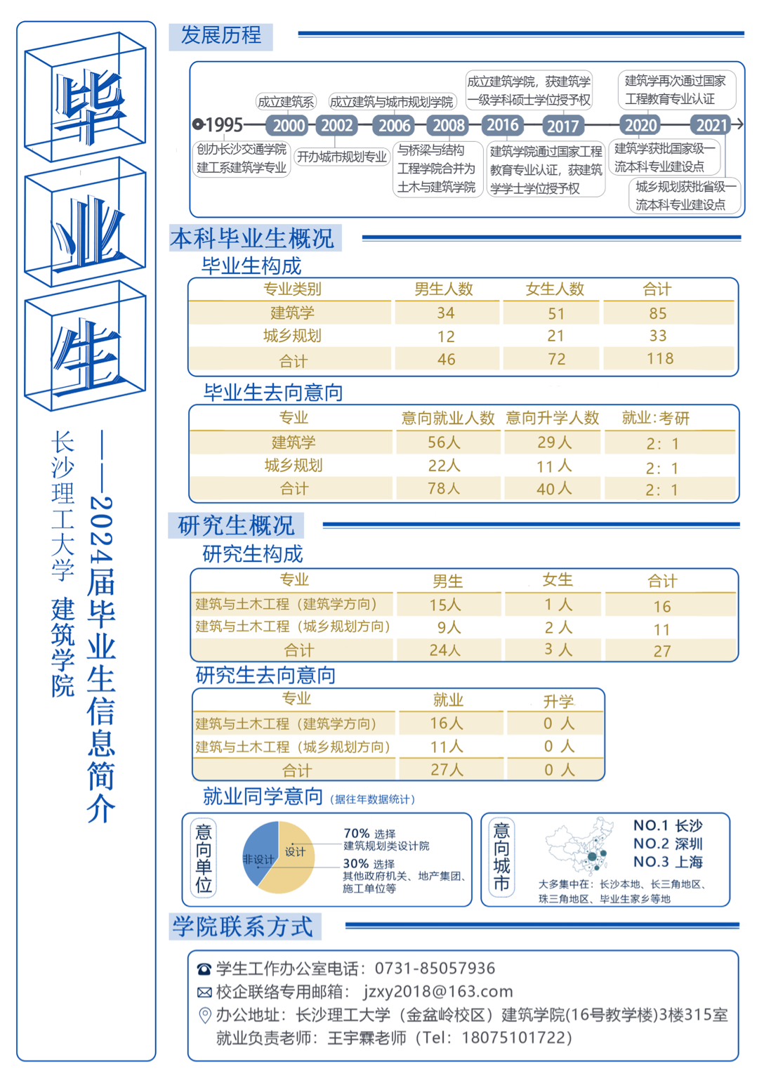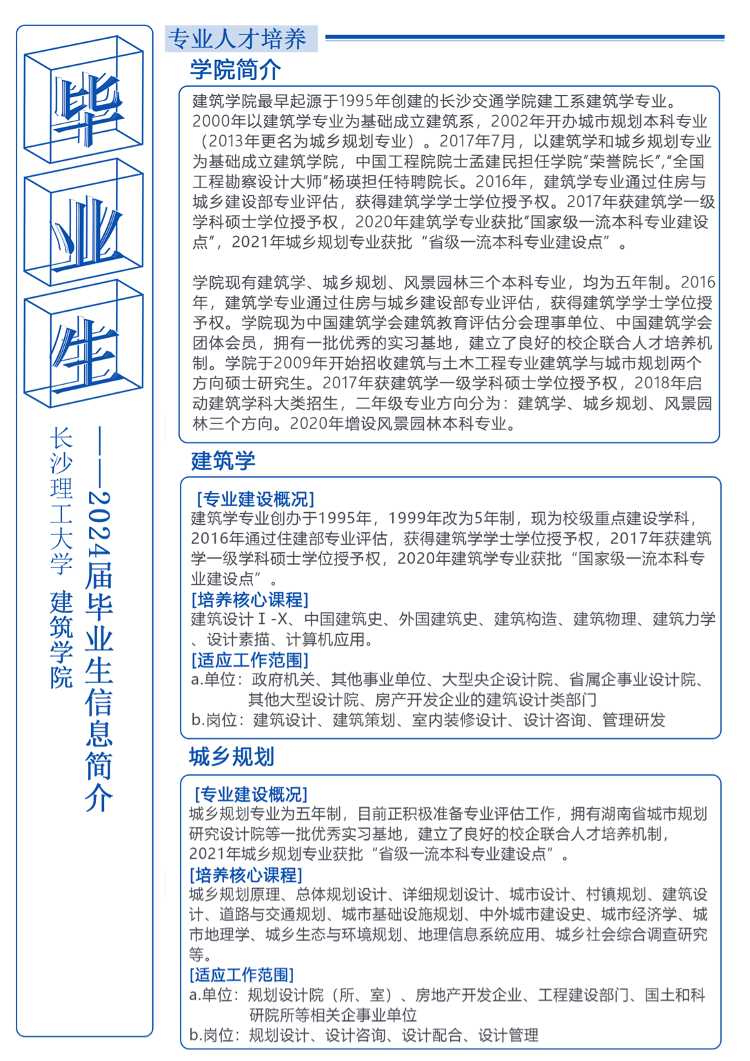 建筑学院最早起源于1995年创建的长沙交通学院建工系建筑学专业。2016年,建筑学专业通过住房与城乡建设部专业评估,获得建筑学学士学位授予权。2018年获建筑学一级学科硕士学位授予权,2020年建筑学专业获批“国家级一流本科专业建设点”,2022年城乡规划专业获批“省级一流本科专业建设点”,2023年6月通过住建部评估。学院2024年共有本科毕业生118名,研究生毕业生27名(毕业生信息详见《附件一》)。