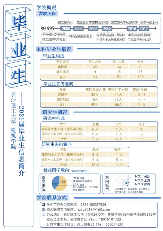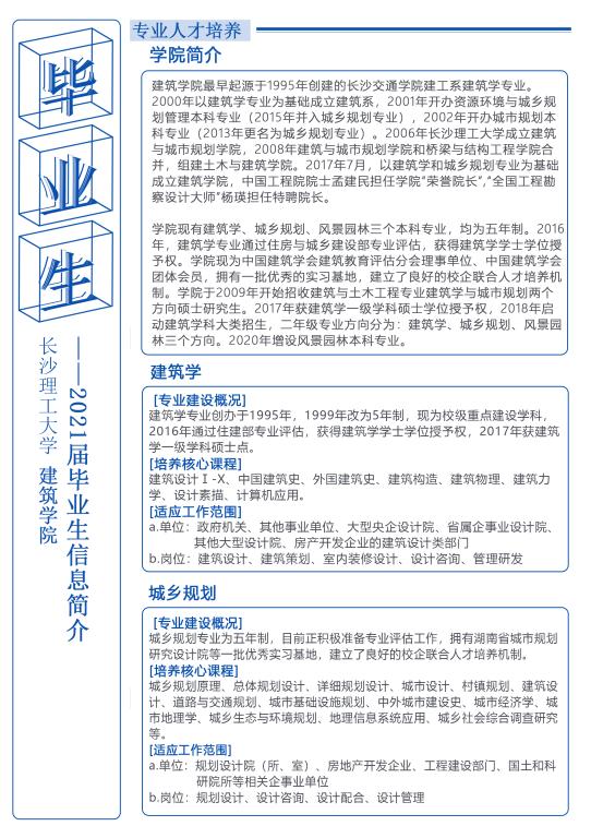 衷心感谢贵单位长期以来对长沙理工大学建筑学院毕业生就业工作的关心和支持!建筑学院 2021 届毕业本科生共有 106 人,其中建筑学专业 79 人,城乡规划专业 27 人,毕业研究生共有 11 人,其中建筑学方向 7 人,城乡规划方向 4 人(毕业生信息详见附件一)。为使我院毕业生与用人单位达成良好的沟通,配合贵单位做好 2021 届毕业生接收工作,我院兹定于 2020 年 10月 20 日——10 月 31 日举办长沙理工大学建筑学院 2020 年秋季专场招聘会。诚挚邀请贵单位光临指导!
