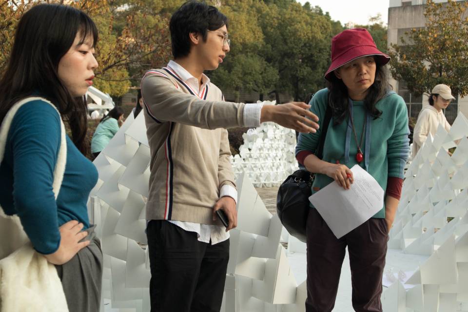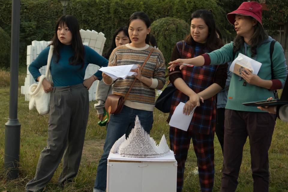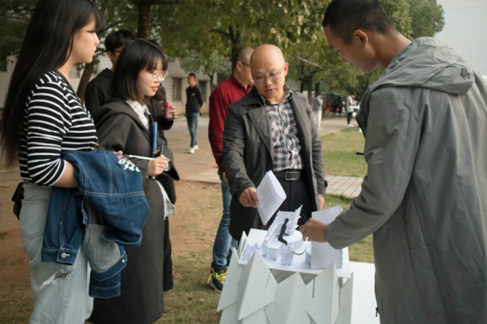 11月12日下午,我院结合课程教学的“魅力校园”主题建构活动已临近尾声。此次课程指导老师前往建筑学院前坪对同学们的作品进行评分与指导,小组成员齐聚于此,为前来评阅建构模型的老师们进行详细讲解。