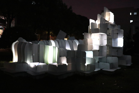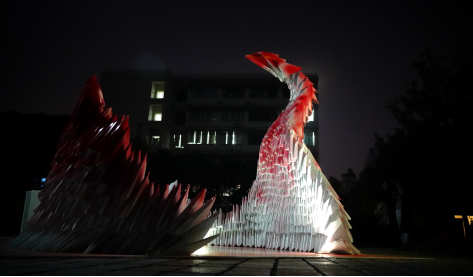 建筑学院前坪的10块建造基地上,《光影回廊》《踏雪寻梅》《凤凰涅槃》等作品各彰特色,在夜晚的光线下,更显曼妙。路过的行人纷纷驻足,为其留影。