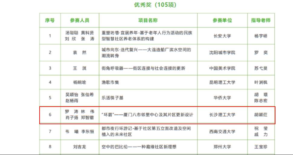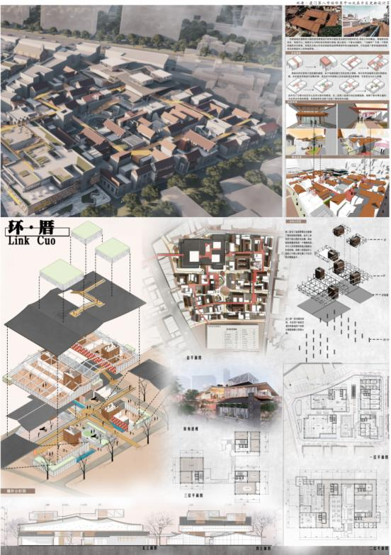 在胡颖荭老师的指导下,长沙理工大学建筑学院2017级的罗涛、林伟、郑智锴、肖子扬四位同学在与全国各高校的竞赛团队同台竞技中,以“环厝——厦门八市邻里中心及其片区更新设计”的设计作品荣获“优秀作品奖”。该设计针对厦门市思明区第八市场内的住区进行改造并新建一个社区邻里中心,以“造物环”的概念形成城市空间系统,以古厝为原型进行“转译”,赋予建筑空间独特的地域特色。