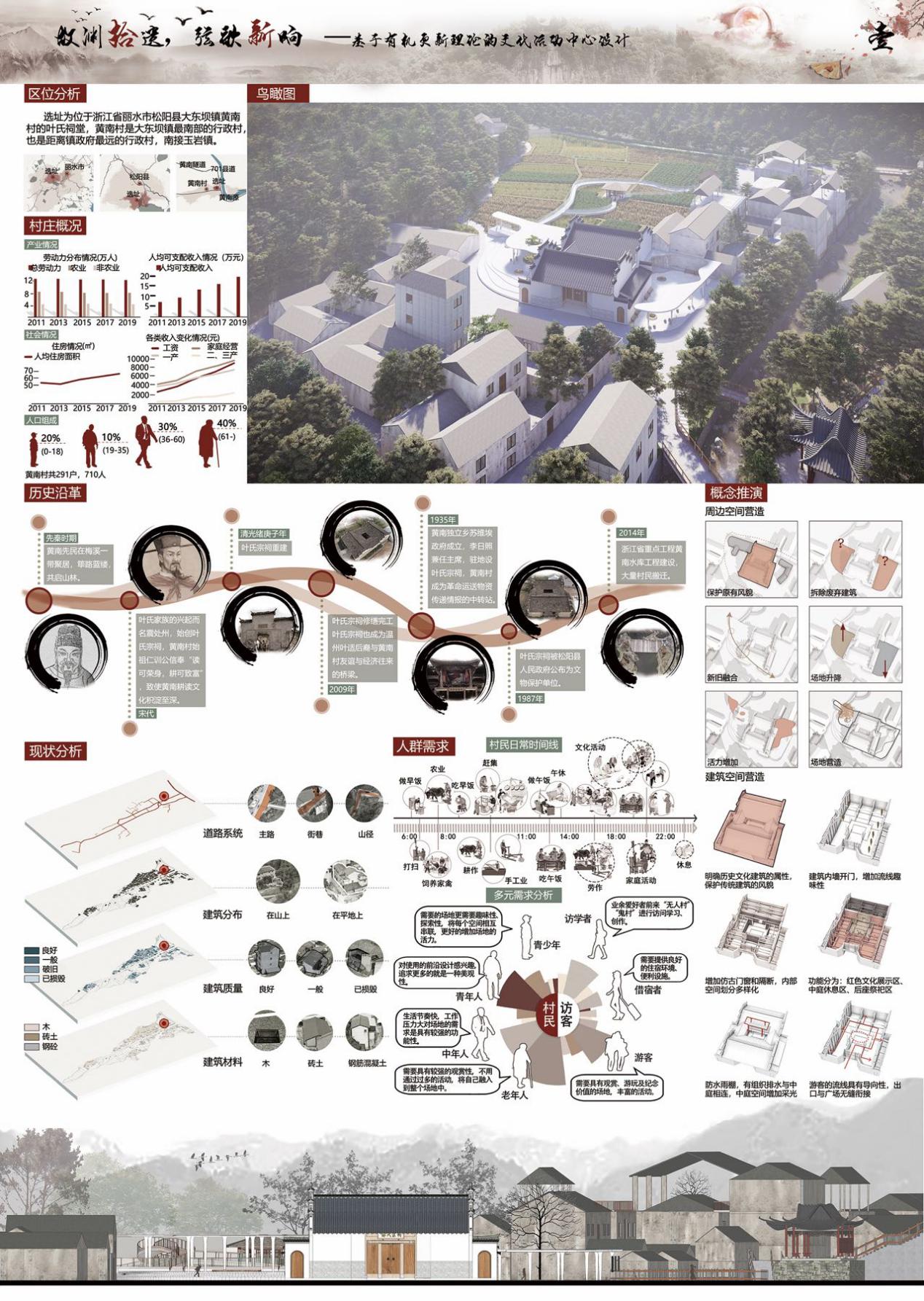 本次乡村设计方案单元共有51个作品进入遴选,经过逆序淘汰、优选投票、排名打分和评议环节,评出各等级奖项,最终结果为:一等奖1个、二等奖2个、三等奖3个、优胜奖3个、佳作奖15个。我院由欧阳国辉、王轶老师指导的孙福鑫、王强、肖文秀、吴旭安、陈鸿杰同学的作品《故渊拾遗,弦歌新响》荣获佳作奖。