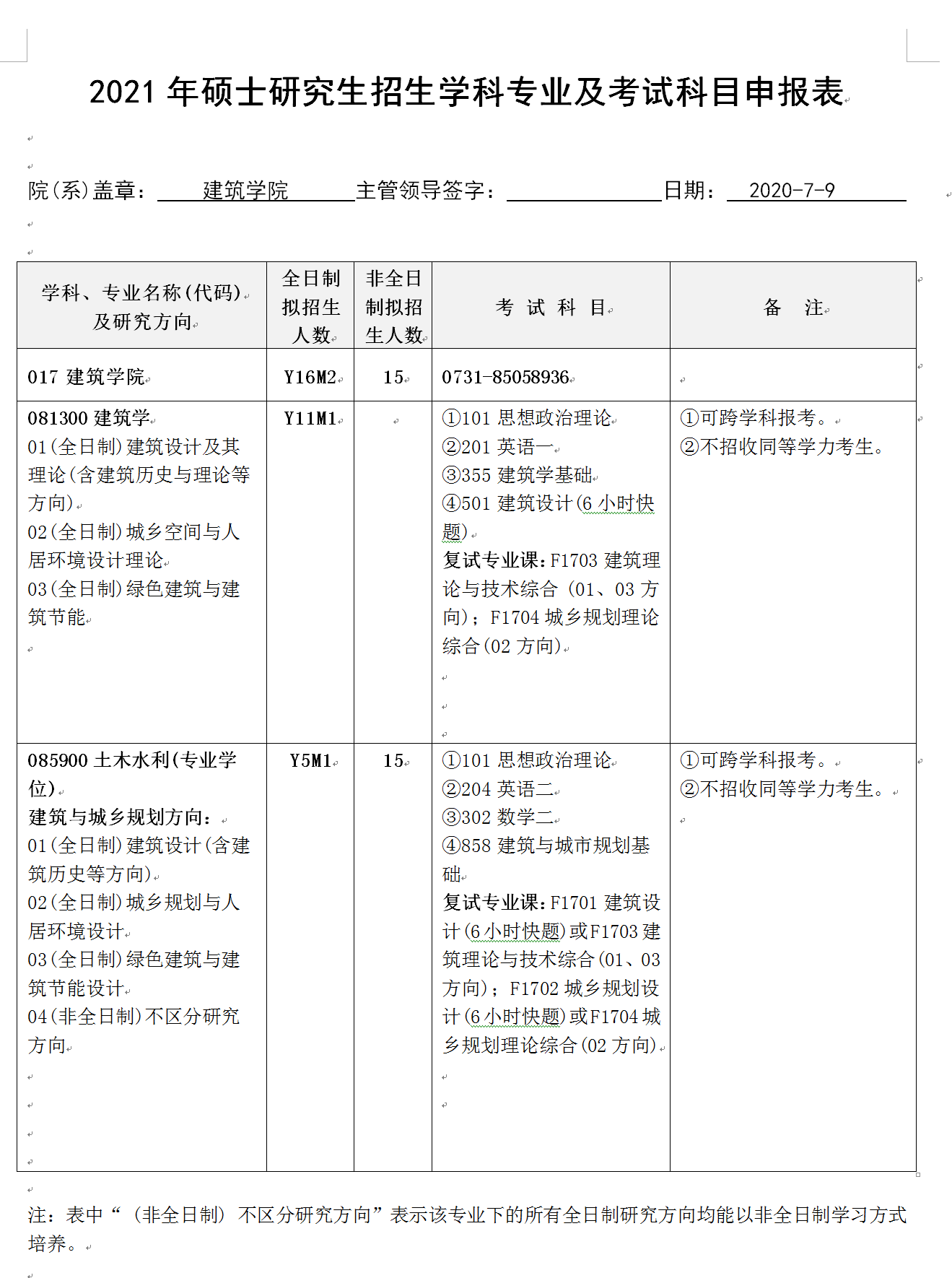 建筑学院2021年硕士研究生招生学科专业及考试科目申报表.doc