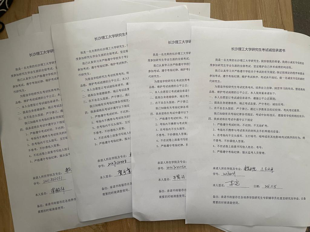 周芳领学了《国家教育考试违规处理办法》、《长沙理工大学学生违纪处理办法》、《长沙理工大学学生违纪处理条例(2018)》和《长沙理工大学研究生学籍管理规定》,参会人员签署了《长沙理工大学研究生考试诚信承诺书》。