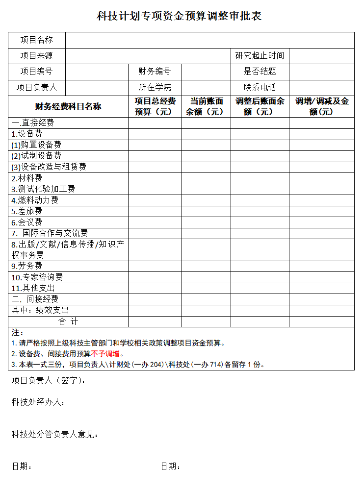 科技计划专项资金预算调整审批表