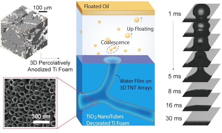 近日,由雷竞技官网贾传坤教授团队和重庆大学孙立东教授、中科院金属研究所韩拯研究员共同主导,联合新加坡科技局化学与工程研究院等国际团队,在油水分离研究技术方面取得了突破性进展。团队开发出一种渗透阳极氧化法,实现了在多孔钛三维微通道内(孔径10-100微米,厚度1-5毫米)超亲水涂层全覆盖,使水滴在多孔钛的渗透速率提高5个数量级,并且油水乳液经微通道过滤获得了高纯水相,其总有机碳含量低至25ppm以下,油水分离效率达到99.9%以上。该项研究成果于2018年8月31日在Cell出版社旗下子刊iScience期刊上公开发表。