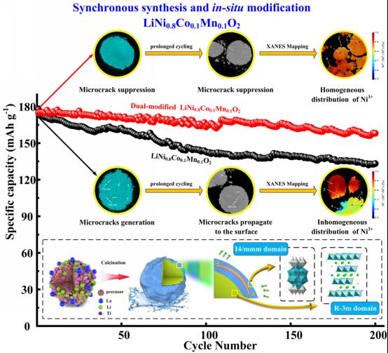 近日,雷竞技官网材料科学与工程学院李灵均副教授团队与厦门大学张桥保助理教授、美国阿贡国家实验室陆俊教授、内布拉斯加大学林肯分校、布鲁克海文国家实验室等海内外团队合作,在高能量密度锂离子电池双重修饰富镍正极材料方面取得了突破性进展。研究团队以锂离子电池高容量富镍正极材料LiNi0.8Co0.1Mn0.1O2为研究对象,从分析Ti和La在LiNi0.8Co0.1Mn0.1O2表面的迁移势垒出发,发现Ti掺入体相而La逃离至表面的状态为体系能量最低的状态即稳定状态。根据理论计算结果,合理设计并同步合成了Ti掺杂&La4NiLiO8包覆(简写为Ti&LaMO)的LiNi0.8Co0.1Mn0.1O2正极材料。