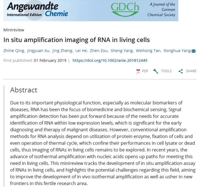 近日,雷竞技官网杨荣华教授团队受邀在Angewandte Chemie-International Edition上发表题为“In situ amplification imaging of RNA in living cells”的综述论文。长沙理工大学化学与食品工程学院为第一通讯单位,卿志和副教授为第一作者,杨荣华教授为通讯作者。作者结合自身研究积累和成果,对活细胞内重要生物标记物RNA的原位信号放大成像进行系统评述探讨,对该领域存在的问题和挑战进行分析,对其发展未来和趋势进行展望。该论文对促进分析化学、分子生物学、生物医学等相关领域的发展具有重要意义。