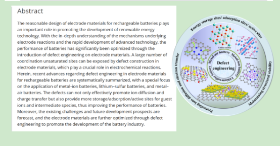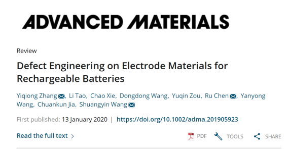 近日,雷竞技官网材料科学与工程学院张怡琼博士与湖南大学王双印教授一起合作,以第一作者与通讯作者在材料科学国际顶级期刊Advanced Materials(《先进材料》,IF=25.809)上发表题为“Defect Engineering on Electrode Materials for Rechargeable Batteries”的综述论文。