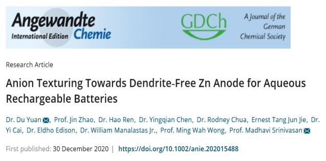 近日,雷竞技官网湖南省“团队百人计划”核心成员、湖湘学者、材料学院袁度博士与合作者们在化学领域国际权威期刊《ANGEWANDTE CHEMIE-INTERNATIONAL EDITION》上以长沙理工大学为第一署名单位发表科学研究成果“Anion Texturing Towards Dendrite-Free Zn Anode for Aqueous Rechargeable Batteries”。袁度为第一作者和第一通讯作者。