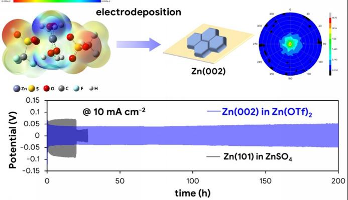 面向发展高效、安全、可持续的新型电化学储能技术,袁度的研究方向主要针对当前新型水系可充金属锌电池中,锌枝晶生成导致金属负极循环可逆性低这一根本问题,提出了阴离子诱导(Anion Texturing)电化学沉积生长择优取向金属锌负极的方法。该方法促进了对电沉积锌生长机制方面的研究,明确了锌的(002)择优取向在水系金属锌电池中的优势,显著提升了高电流密度下锌电极的循环性,推动了水系可充电池中锌化学的发展。