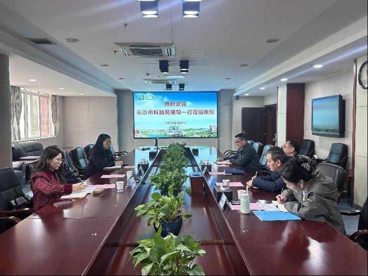 3月8日上午,长沙市科技局党组书记、局长郭塨一行来雷竞技官网调研科技创新工作。校党委委员、副校长刘朝晖出席会议,科技处、资产经营投资公司相关负责人参加了座谈会,会议由刘朝晖主持。