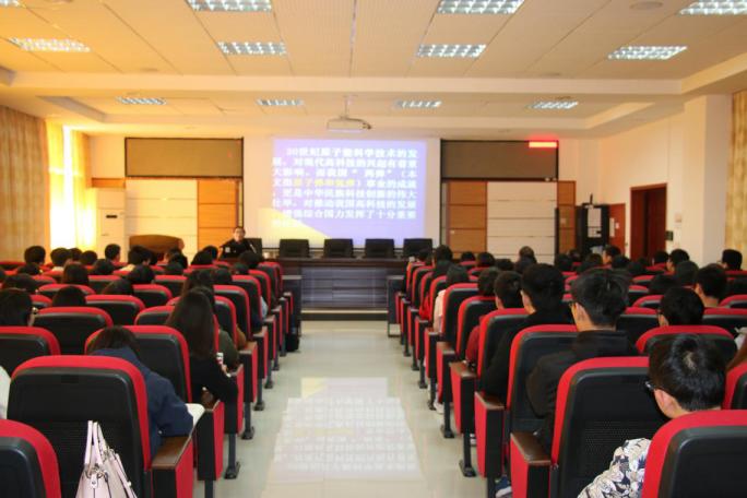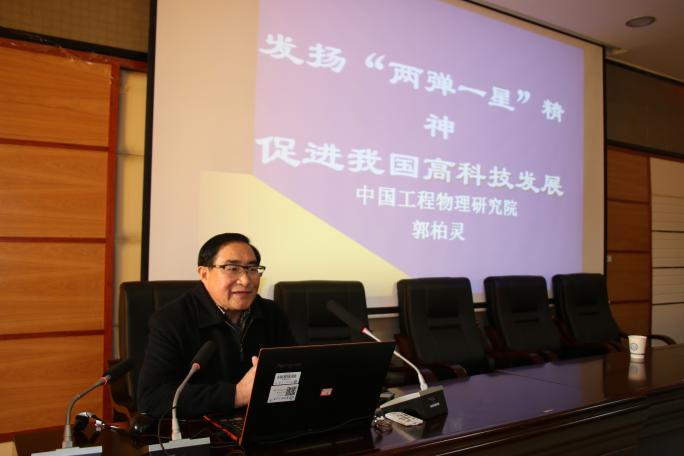 学校原常务副校长洪源渤对郭柏灵院士的到来表示欢迎。报告会上,郭柏灵院士回顾了我国“两弹一星”事业的发展史,介绍了中国核武器的研制背景、发展历程及“两弹一星”事业取得重大突破的成功经验。他结合自身参与“两弹”研究的经历,用大量感人的事例和图片资料,向大家讲述了“两弹一星”功勋奖章获得者钱三强、彭桓武、邓稼先、郭永怀、朱光亚、周光召等老一辈科学家在艰苦的条件下无私奉献,克服种种困难,为“两弹一星”的研制成功做出突出贡献的感人事迹。