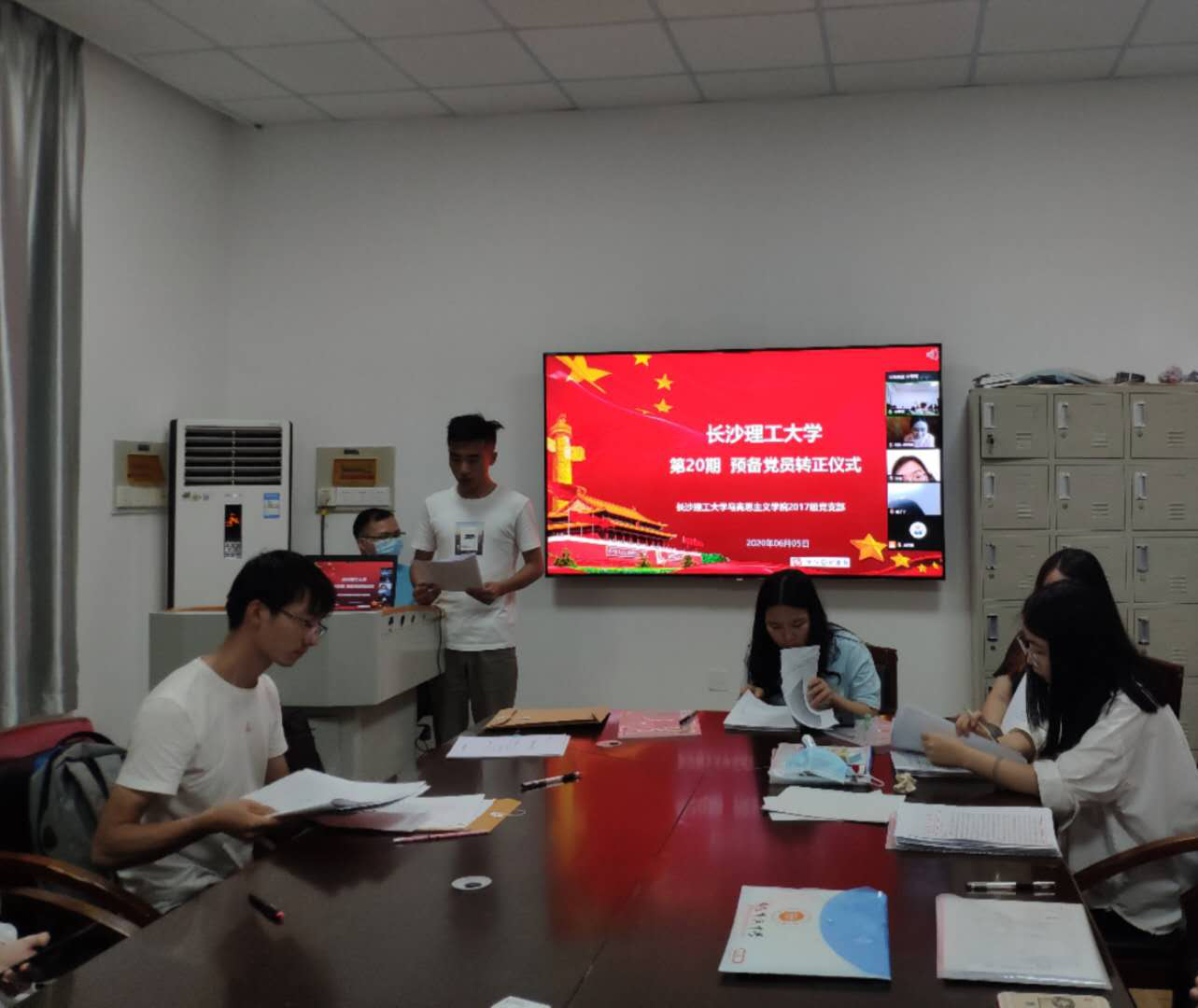 2020年6月5日星期五下午两点,马克思主义学院2017级党支部在四教501召开第20期预备党员转正大会。会议由2017级党支部书记焦浩源主持,支部的正式党员及预备党员共30名,与会26名,未能现场赶到的4名同志通过腾讯会议在线参加。