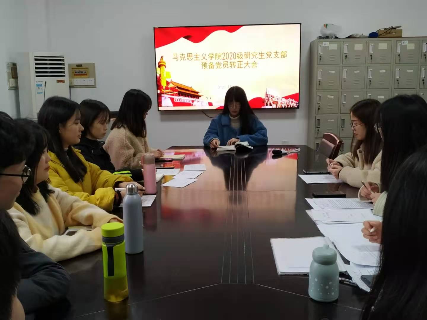 2020年11月25日星期三下午两点半,中共长沙理工大学马克思主义学院2020级研究生党支部委员会在四教503召开预备党员转正大会。本次会议由2020级党支部书记王静怡主持,参加会议的正式党员应到13名,实到10名;参加会议的预备党员应到3名,实到3名。