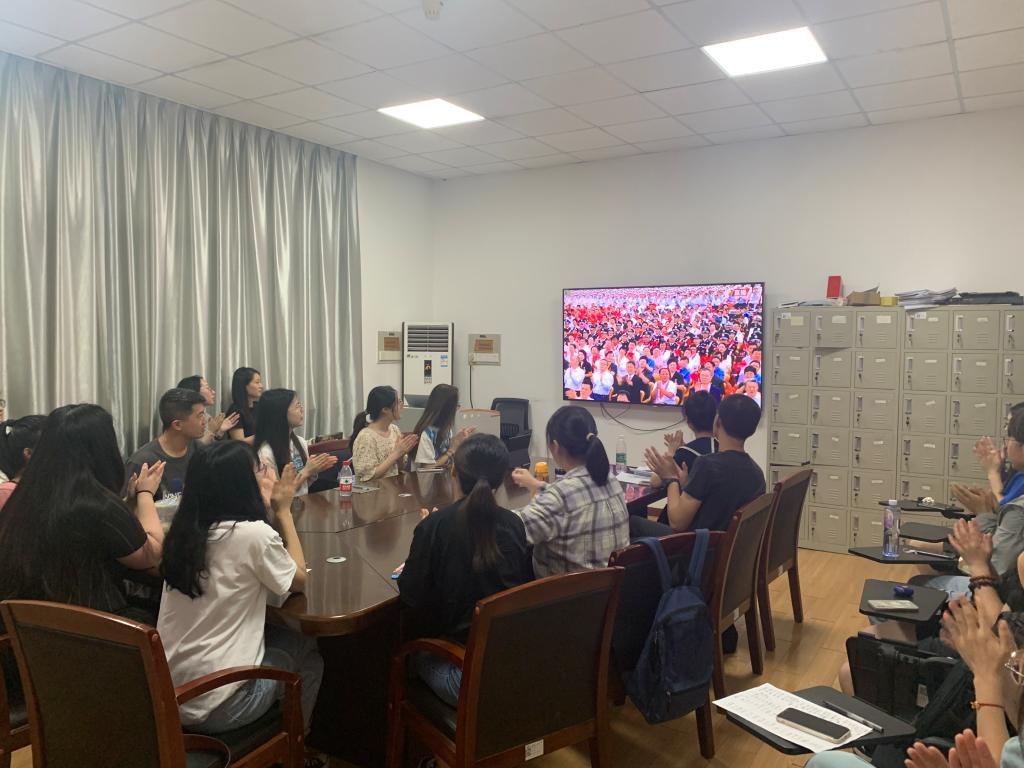 直播过程中,同学们聚精会神、目光坚定,怀着深情与期待共同见证这一重大而庄严的历史时刻。大家一边收看一边认真记录讲话要点,气氛热烈处,会场也爆发出阵阵掌声与欢呼。