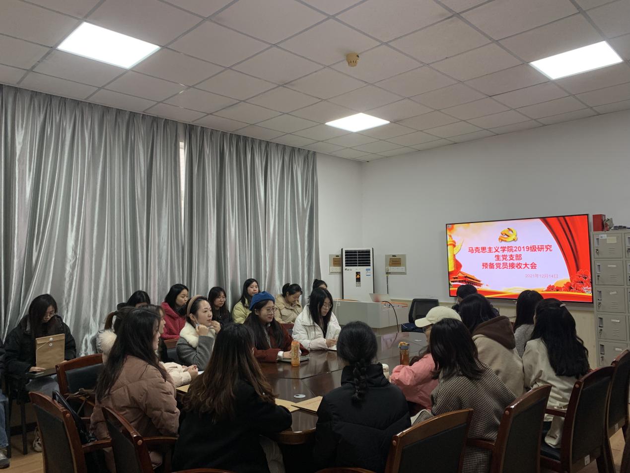 2021年12月14日,马克思主义学院2019级研究生党支部在金盆岭4教举行预备党员接收大会,参加会议的人员为2019级研究生党员、预备党员和发展对象。